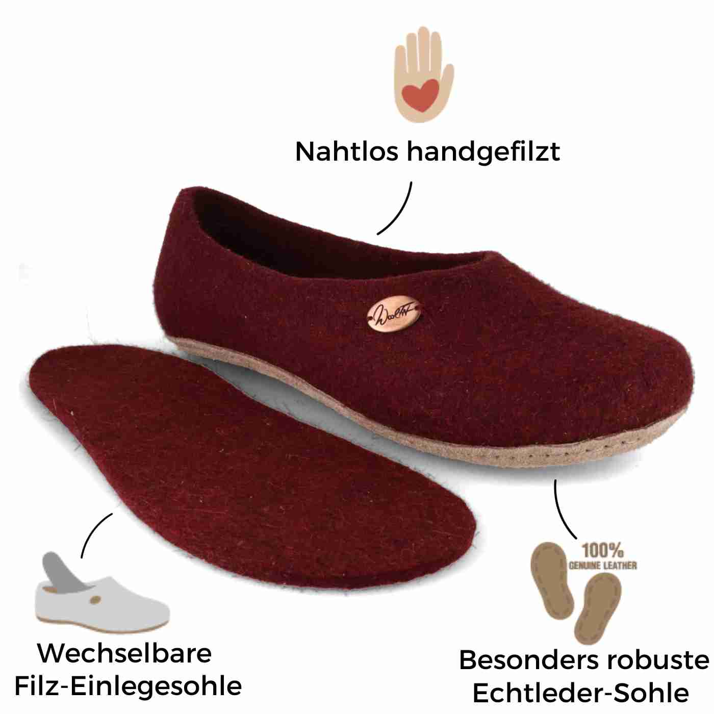 - Handwäsche: Wir empfehlen die Handwäsche, jedoch können WoolFits mit Ledersohle auch in der Waschmaschine gewaschen werden.