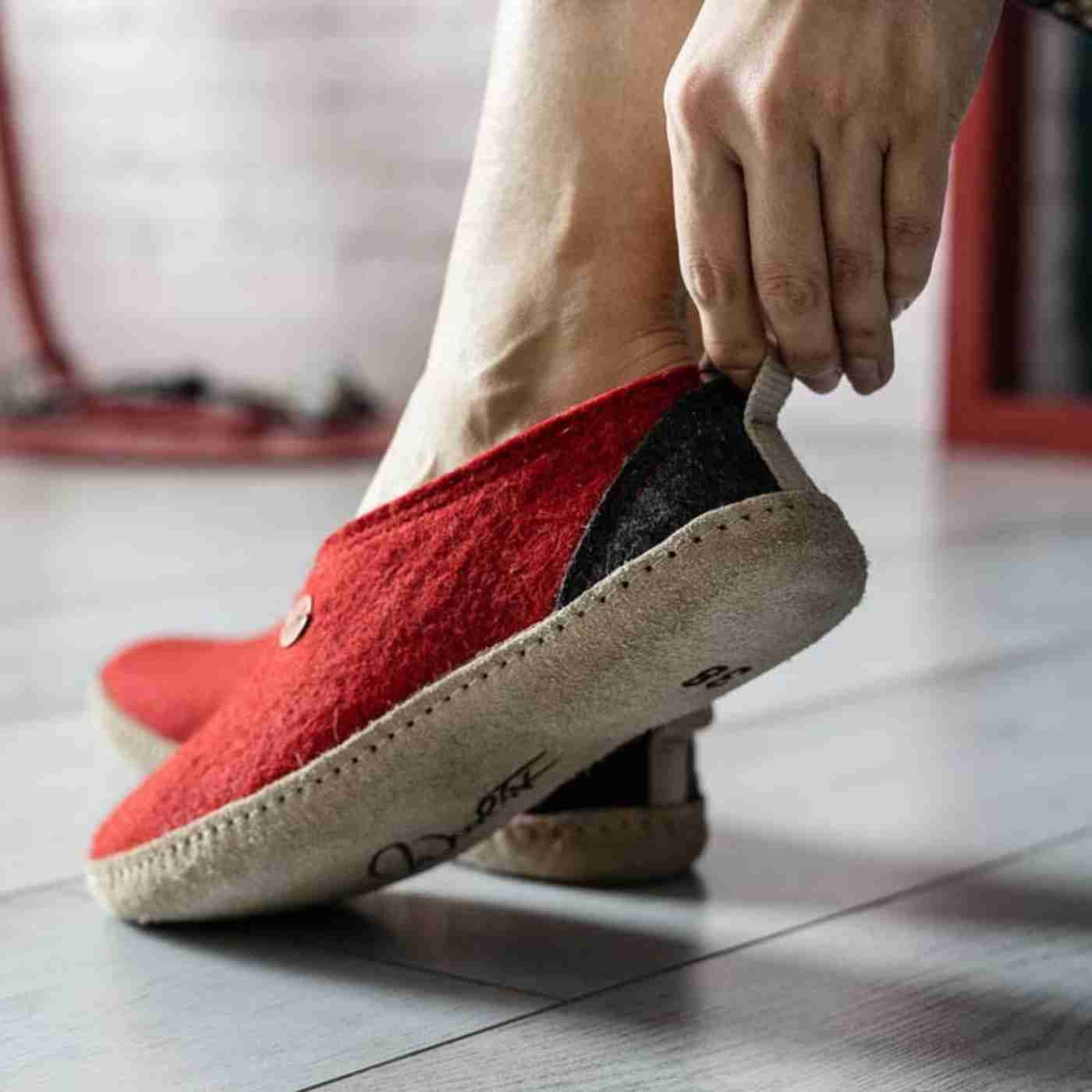 Auch er besteht aus Filz aus 100% natürlicher Wolle und einer robusten Sohle aus echtem Leder. Das macht ihn zum minimalistischen Fußschmeichler.